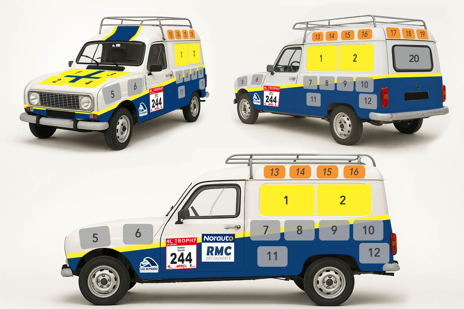 Nous serons ravis d’échanger avec vous pour choisir l’emplacement le plus approprié pour votre logo sur notre 4L et vous proposer le pack le mieux adapté à vos objectifs.
